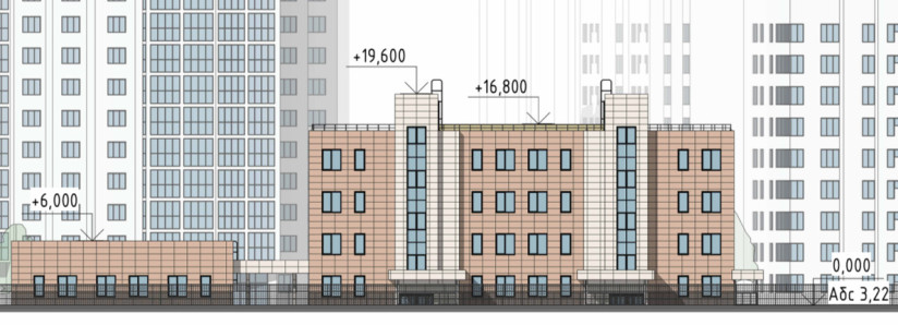 Судя по эскизу, предполагается возвести два разновысотных блока. Максимальная высота одного из них составит 6 метров, другого – 19,6 м (четыре этажа). Под застройку отведен участок с кадастровым номером 78:40:0008307:37 площадью почти 0,38 га.