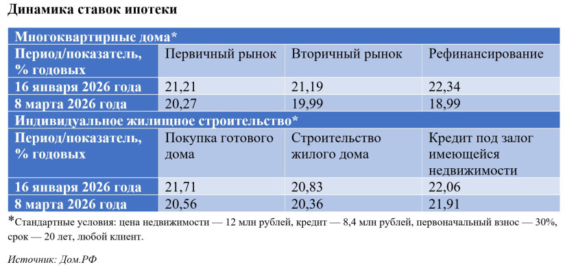 За два месяца, с января по март 2026 года, средняя рыночная ставка по ипотеке в России снизилась на 0,98% для первичного рынка и на 1,23% для вторичного, следует из статистики Дом.РФ. Это существенно больше, чем за квартал с октября 2025 года по январь 2026-го, когда ставки уменьшились лишь на доли процентов, а по некоторым продуктам даже выросли.