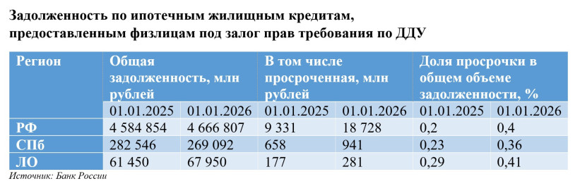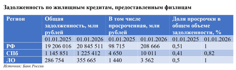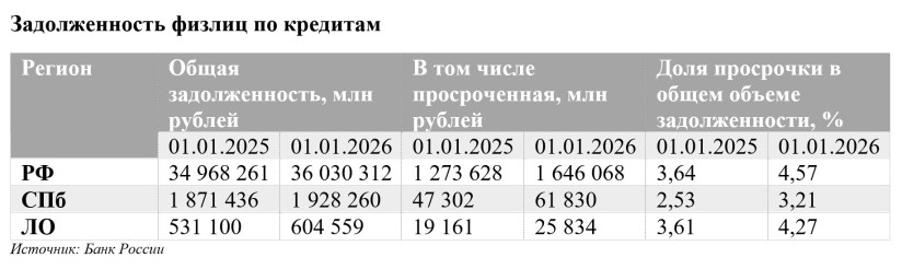 Из статистики Банка России видно, что задолженность граждан по кредитам за год, с января 2025 года, выросла незначительно — всего на 3%. Однако при этом просроченная задолженность увеличилась на 29,2%. В Петербурге почти такая же динамика: 3% рост долга и 30,7% прибавила просрочка. В Ленобласти соответственно +13,8% и +34,8%.