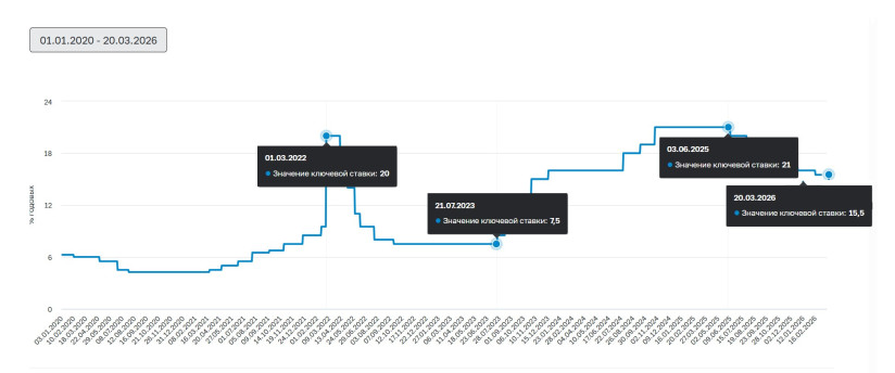 Совет директоров Банка России сегодня, 20 марта, снова понизил ключевую ставку на 50 базисных пунктов — до 15% годовых.