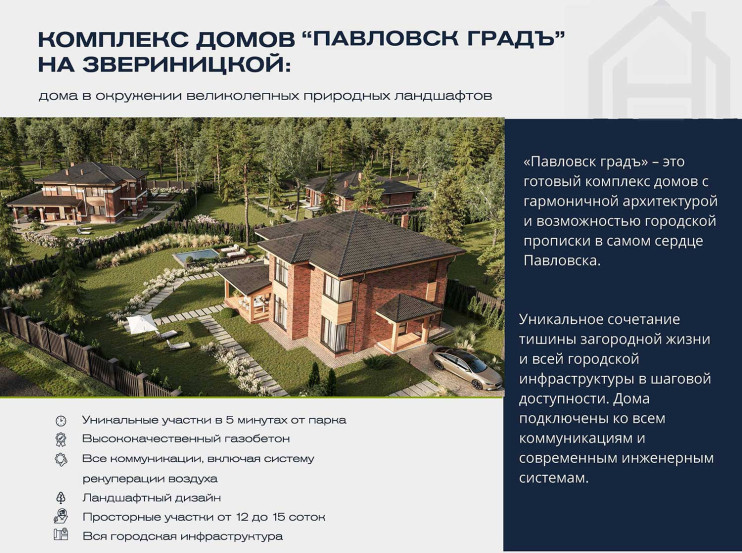 — Да, КП «Павловск градъ» построен рядом с Павловским парком. Основной упор мы сделали на существующую инфраструктуру и окружение. Решили реализовать проект бизнес-класса с акцентом на архитектуру, фасадные решения и естественные материалы (дерево, кирпич, стекло). Хочу подчеркнуть, что большие окна с панорамным остеклением, по сути, уже стали стандартом, как и привычные нам теплые полы. Поселок почти реализован, семь из восьми домов проданы.
