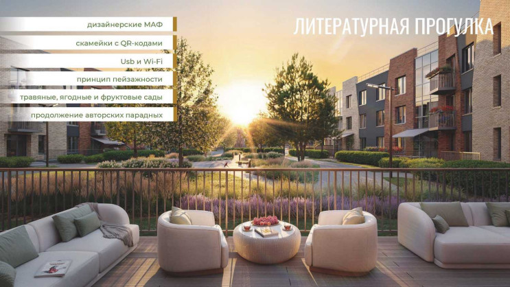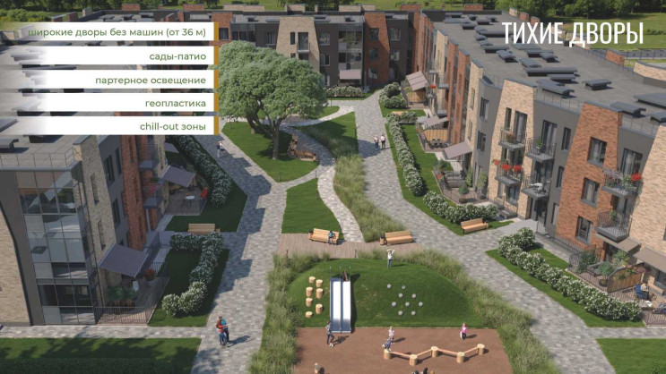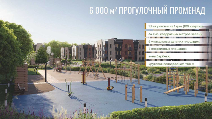 В комплексе предусмотрены просторные общественные пространства. Если соединить все прогулочные зоны, общая протяженность променада составит почти 1,5 км. Вдоль бульвара расположатся спортивные и досуговые площадки для разных возрастных групп, зоны отдыха и пр. Все это должно способствовать общению и добрососедству.