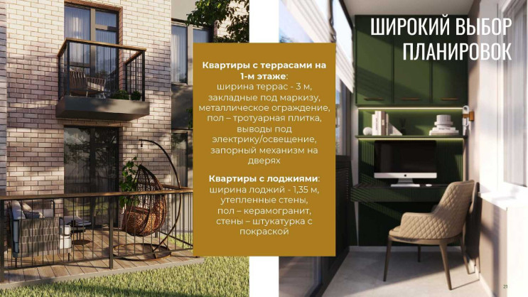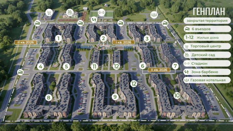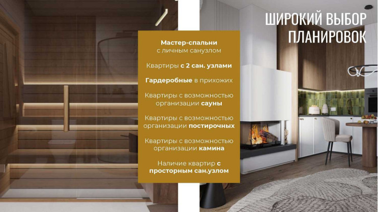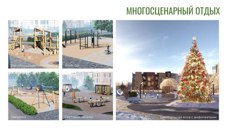 У комплекса закрытая территория, центральный променад с елкой, зонами отдыха для детей и взрослых, зона барбекю, велодорожки, дворы без машин. Все этажи жилые, на первых – оборудованы просторные террасы, а вся коммерция вынесена в отдельный торговый центр. У нас более 40 видов планировочных решений, в том числе с каминами и саунами. Кладовые для каждой квартиры.