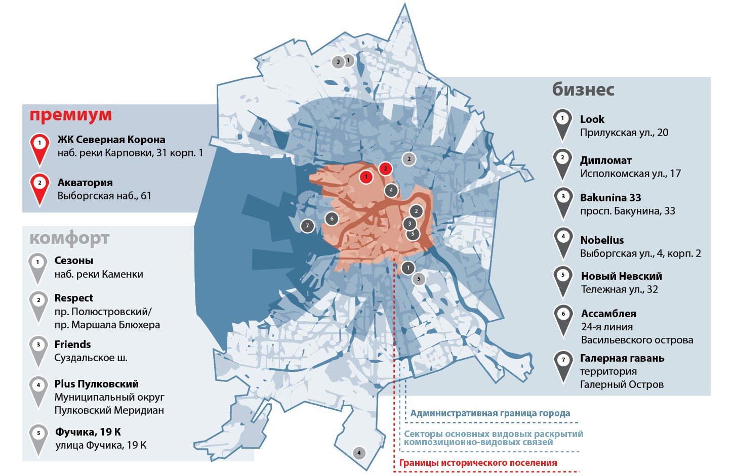 На следующем этапе анализируется возможность строительства дома с конкретными потребительскими характеристиками на выбранном пятне. Например, для сегмента «премиум» компания выделила зоны в границах исторического поселения Петербурга. Для бизнес-класса – территории, в пределах которых раскрываются виды на охраняемые территории исторического поселения. Все остальные локации – для категории «комфорт».