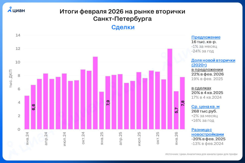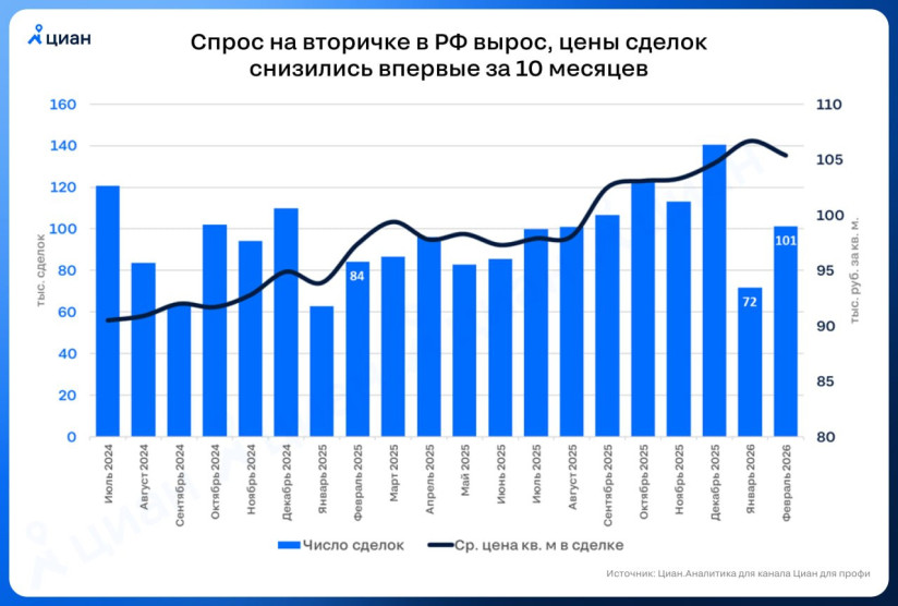 По данным аналитиков «Циана», в феврале в России было проведено 101 тыс. сделок с квартирами в готовых домах. Рост составил 41% в месячном и 21% — в годовом выражении. Причем впервые за десять месяцев снизились цены сделок (на 1,2%, до 105,4 тыс. рублей за кв. м), а также уменьшилась доля «новой вторички», то есть квартир в недавно построенных домах. Если в предыдущем квартале доля таких объектов составляла 18,5% продаж, то в феврале 2026-го — 16,1%.