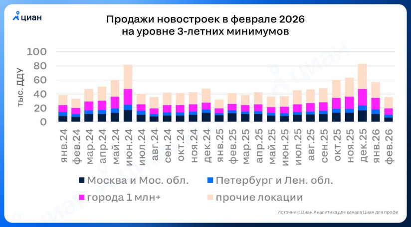 Для сравнения: на первичном рынке февраль оказался провальным как по сравнению с январем (36 тыс. сделок против 57 тыс. в январе), так и против уровня февраля 2025-го (41 тыс.).