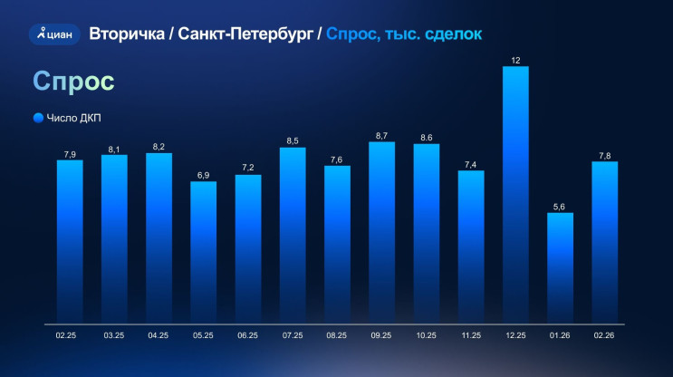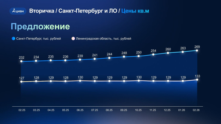 Все эти изменения привели к росту цен на вторичное жилье. Так, в Петербурге в феврале оно в среднем подорожало почти на 16% к февралю 2025-го и на 2,3% — к январю 2025-го. Среднемесячное подорожание в 2025 году не превышало 1,3%.