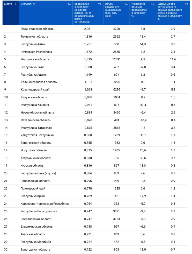 Ленобласть по сравнению с 2024 годом улучшила результат, сохранив лидерство: в прошлом году в регионе пришлось по 1,98 кв. м на человека и в целом ввод в эксплуатацию составил 4,065 млн «квадратов», в 2025-м — 2,051 кв. м и 4,22 млн.
