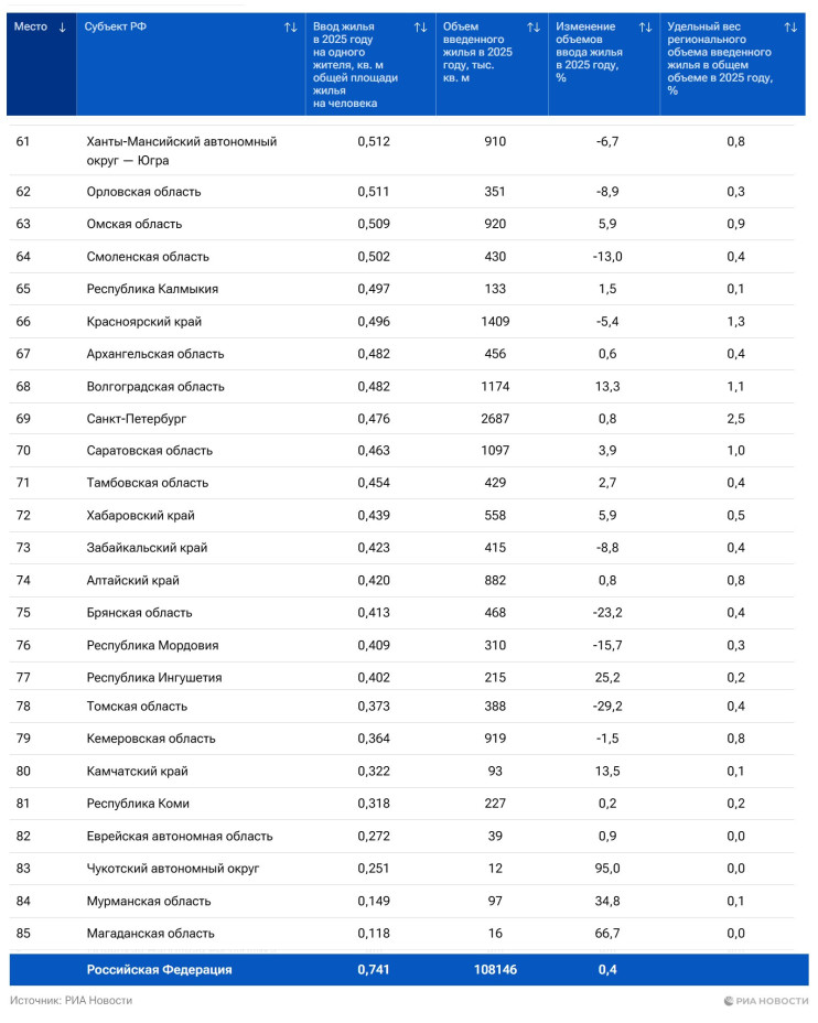 Среднероссийский показатель — 0,741 «квадрата» на гражданина, как и в 2024 году. Всего в 2025 году в стране было сдано около 108,1 млн кв. м жилья.