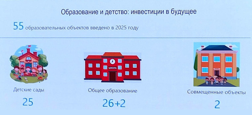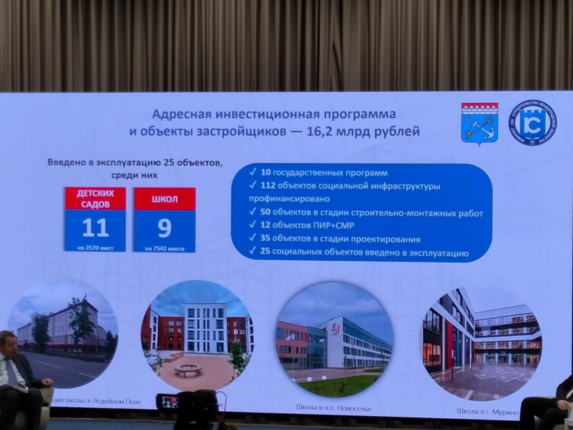 В рамках АИП в 2025 году было освоено 16,2 млрд рублей, построено 11 детсадов и девять школ, дом культуры в Красном Бору, поликлиника в Кировске и другие объекты. План на 2026 год: бюджет АИП 11,3 млрд рублей, 18 соцобъектов к сдаче, строится в целом 93.