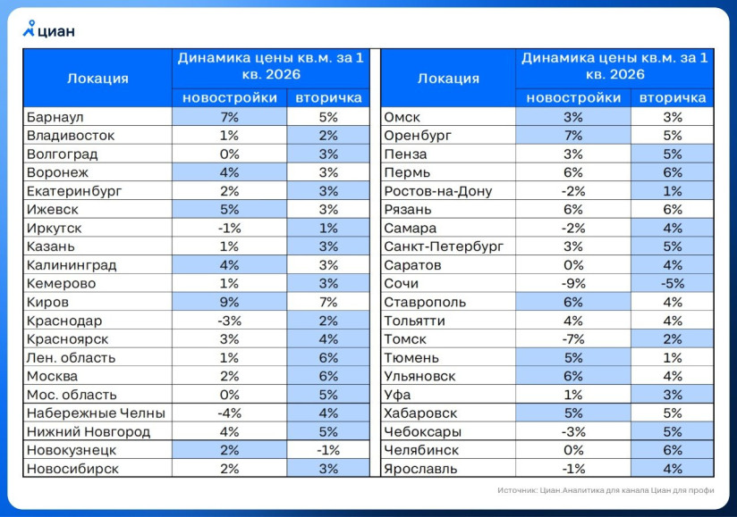 «Вторичка» в Петербурге за первый квартал по сравнению с концом 2025 года подорожала на 5%, а «первичка» — всего на 3%. Аналогичная ситуация в Ленобласти: готовое жилье прибавило в цене 6%, новостройки — лишь 1%.
