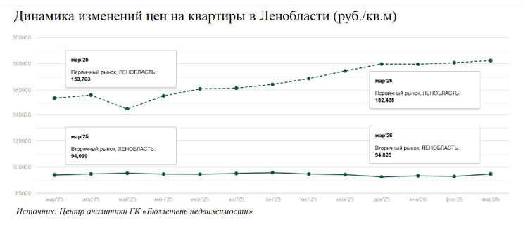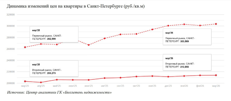 Если сравнивать цены марта 2026-го и 2025 года, то динамика оказывается прямо противоположной. Ее фиксирует Центр аналитики ГК «Бюллетень недвижимости»: в Петербурге квартиры в новостройках с марта 2025 года подорожали на 15,43%, а вторичное жилье — лишь на 5,25%. В Ленобласти разница еще больше: плюс 18,65% «первичка» и менее 0,8% — «вторичка».