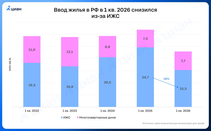 Объем строящихся домов в сегменте ИЖС в России по итогам первого квартала 2026 года снизился на 38%, до пятилетнего минимума. Было построено всего 15,3 млн кв. м индивидуального жилья.