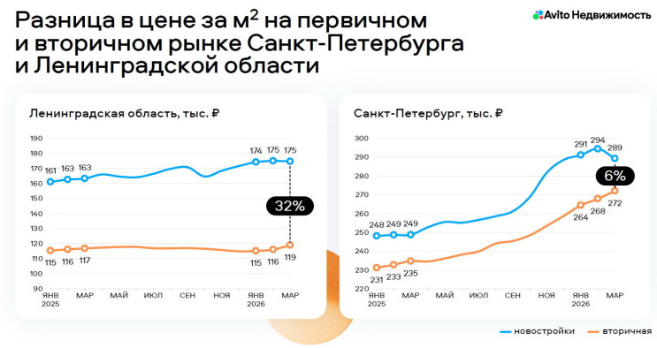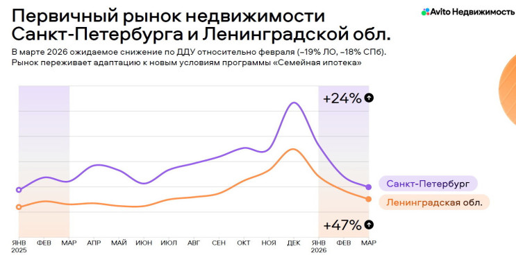 Ситуация на первичном рынке региона более неопределенная. С одной стороны, за первый квартал в Петербурге сделок заключено на 24% больше (год к году), а в Ленобласти – на 47%. С другой, в марте аналитики Авито зафиксировали снижение на 18% и 19% соответственно.