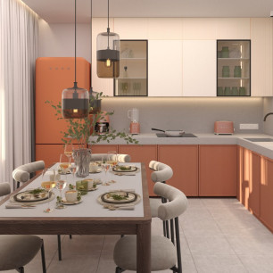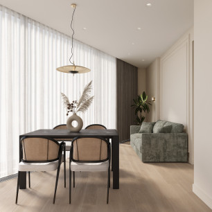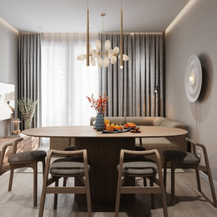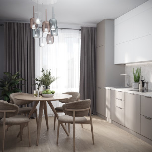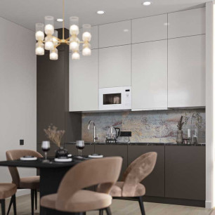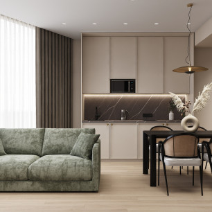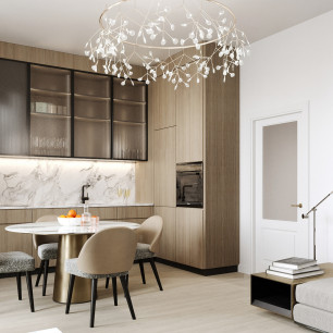 В каждом юните – аккуратно встроенный кухонный блок. Его белые фасады заполняют пространство до потолка; фартук и столешница выполнены на контрасте – из темного мрамора с белыми прожилками; фурнитура – под латунь, и тот же бронзовый оттенок перекликается с цветом подвесных светильников-«тарелок». Вся техника спрятана за фасадами. Мебель подобрана в той же цветовой гамме: круглые столы с черным основанием, стулья с ротанговыми вставками. Разбавляет палитру диван оттенка шалфея – мягкий цветовой акцент. Шторы предусмотрены легкие, почти воздушные, они не закрывают вид на город, а только смягчают свет.