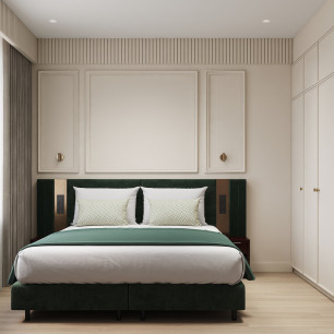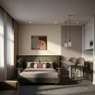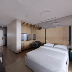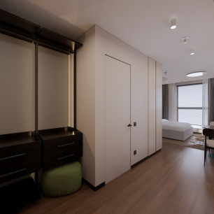 В проекте предусмотрены 108 номеров различных категорий площадью от 20 до 63 кв. м. Каждый юнит сдается с чистовой отделкой, мебелью и техникой. В номерах предусмотрена полноценная кухня с холодильником, варочной панелью и микроволновкой, а в части планировок – еще и посудомоечная машина. Кроме того, каждый номер оснащен стиральной машиной, что удобно и для коротких поездок, и для более длительного проживания. Ортопедические матрасы создают условия для комфортного сна, а кровати размером 90х200 см можно сдвигать, формируя просторное двуспальное место. Для семейных номеров предусмотрены дополнительные диваны со спальным местом, чтобы разместить 3–4 человека. Отдельный акцент сделан на инженерных и отделочных решениях. В проекте предусмотрено кондиционирование. В санузлах установлены влагостойкие двери, устойчивые к регулярной влажной уборке и не выходящие из строя при гостиничной эксплуатации.