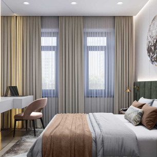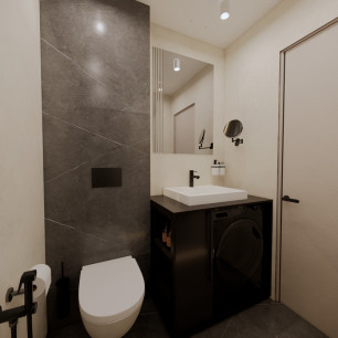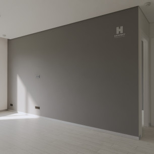 Отделка предусматривает гладкие флизелиновые обои на стенах, на полу – кварц-виниловый ламинат светло-серого цвета, на потолке – натяжные белые матовые потолки с теневым профилем. Стены санузлов и ванных комнат – контрастное сочетание крупноформатной керамической плитки серого и белого цветов; полы санузлов и ванных комнат также оформлены крупноформатным керамогранитом; предусмотрена система теплого пола в ванных комнатах и совмещенных санузлах. Все коммуникации в ванных скрытого исполнения. Полы балконов и лоджий отделаны керамогранитом серого цвета.