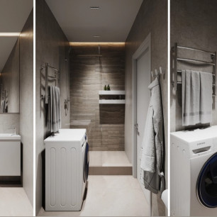 «Комфорт»: премиальные материалы и расширенная комплектация. Те же три стиля, но с более дорогими материалами и функциями. Унитаз – подвесной с инсталляцией, раковина накладная, тумба со столешницей. Смеситель для ванны с терморегулятором, душевая система дополнена верхней лейкой, плюс гигиенический душ. На полу – кварцвиниловый ламинат, стены – гладкие флизелиновые обои под покраску. Это полностью готовое к заселению пространство, остается только расставить личные вещи. Важно – стоимость отделки можно включить в ипотеку.
