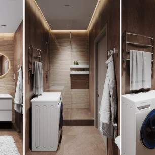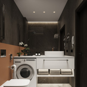 В санузлах предусмотрена композиция крупноформатного керамогранита и керамической плитки. В светлой отделке травертин на акцентной стене сочетается с плиткой светлых тонов, в контрастном варианте используется плитка в коричневых оттенках. В санузлах устанавливается современная европейская сантехника, включая гигиенический душ. Дополняют стильный дизайн зеркало с подсветкой, тумба и полотенцесушитель.