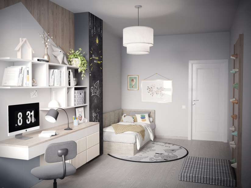 На полу – ламинат, на стенах – антивандальные обои с тиснением под покраску. Межкомнатные двери с износостойким покрытием.
