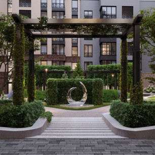 Внутренний камерный сад будет доступен только жителям. Здесь разместят отсылающую к образу кристалла перголу, оплетённую девичьим виноградом.