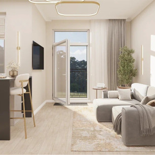 Все юниты передаются покупателям с полной отделкой и меблировкой, готовыми к заезду. Молочно-бежевые стены украшены легкими молдингами (декоративными планками), создающими архитектурные акценты. В этой же тональности – светлый пол, выложенный из технологичного кварцвинила. Увеличенные размеры окон визуально расширяют пространство, наполняя его светом и воздухом.