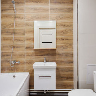 «Эконом»: практичное решение без компромиссов. Светлые интерьеры с акриловой ванной, компакт-унитазом, стандартной раковиной и пьедесталом (без тумбы и зеркала). На полу – ламинат, стены – обои с тиснением под покраску. Санузел и прихожая отделаны плиткой.