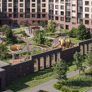 Проектом предусмотрено комплексное благоустройство прилегающей территории и озеленение. Здесь разобьют зоны отдыха, спортивные и детские площадки, камерные беседки для работы на свежем воздухе и встреч с соседями; установят малые архитектурные формы.
