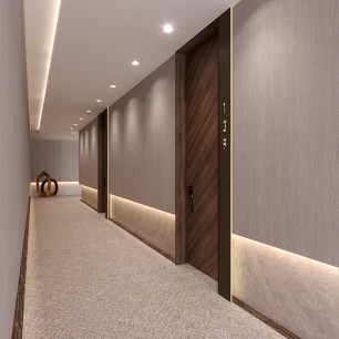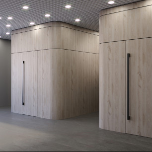 При этом HPL наделяет дверь важными утилитарными качествами: он не боится царапин (от ключей, сумок и пр.), устойчив к мытью с химией (актуально для больниц и транспорта) и, в отличие от натурального шпона, не выгорает на солнце у окна. Для производителей дверей это еще и технологическое преимущество: HPL-панели идеально клеятся на основы, не коробятся от перепадов влажности и позволяют создавать бесшовные фасады без видимых стыков. Так, дверь из инженерного узла превращается либо в арт-объект, либо в невидимку — в зависимости от замысла архитектора. Но в любом случае — в надежный, долговечный и тактильно роскошный элемент.