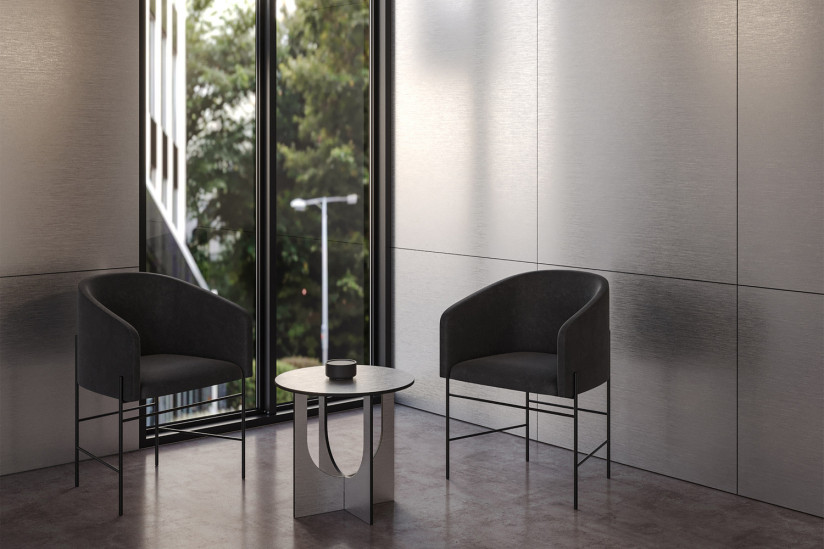 Одна из самых ярких новинок — коллекция Scalar с декоративной металлизированной поверхностью. Материал живет в нескольких ипостасях: тонкий декоративный HPL-пластик для оформления как прямых, так и криволинейных поверхностей, HPL Compact для зон с более высокими нагрузками, мебельные плиты и стеновые панели на основе МДФ или ДСП. Эффект бронзы, меди, золота, стали — без окисления, выцветания и холода настоящего металла. Тактильно материал теплый. Визуально — дорогой. По сути — практичный.