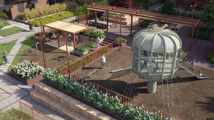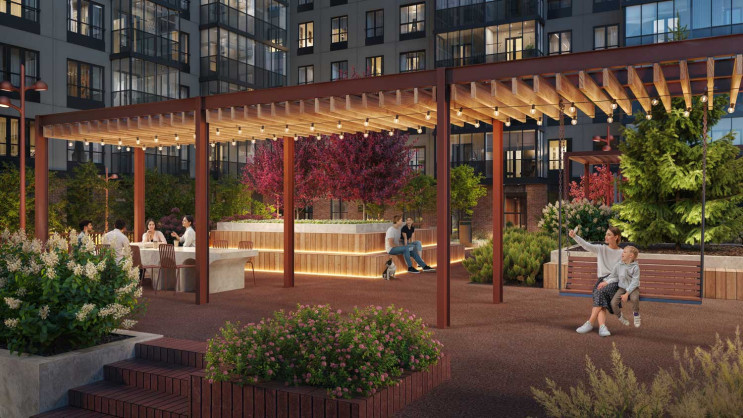 Внутренний двор закрыт от посторонних и машин, полностью благоустроен для отдыха и общения с близкими. На территории будут реализованы зеленые зоны, детские площадки для разных возрастных групп и пространства для спорта. Центральным элементом станет пергола с качелями и большим столом — пространство для встреч, общения и настольных игр. Для отдыха предусмотрены сад ароматных трав, зона с гамаком и лежаками, отдельное место для прогулок с питомцами. Озеленение будет всесезонным, позволяя сохранять атмосферу уюта круглый год.