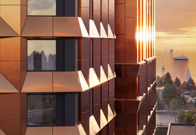 Металлизированные рельефные поверхности фасадов создают игру бликов и света, а благородные медные оттенки воспроизводят рассветы и закаты над Финским заливом. Самобытность и оригинальность элементам придают продуманная посадка корпусов и использование патины и разных оттенков металла. Авторы проекта поставили перед собой задачу обустроить экологичную среду с гарантией комфорта проживания и долговечности зданий.
