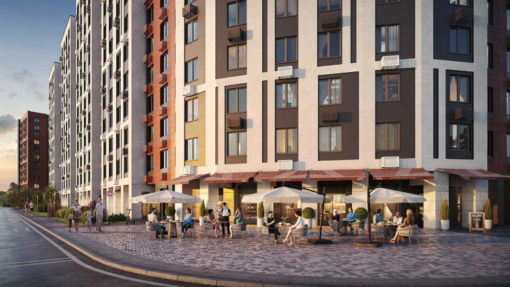 На первых этажах жилых корпусов планируется разместить коммерческие помещения под магазины, кофейни и различные сервисы. Входы в парадные организованы на уровне земли для удобства родителей с колясками.